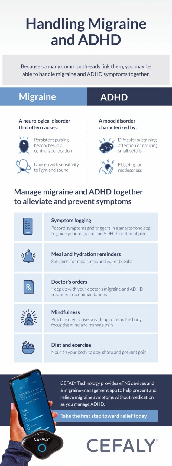 Managing ADHD and migraine can be tricky. ADHD can make it hard to remember migraine remedies, like supplements or exercise routines. Plus, if you take ADHD medication, you may be hesitant to start taking another . CEFALY is a completely drug-free solution, backed by extensive clinical research and available without a prescription. You can use the unique technology of CEFALY to relieve and prevent migraine attacks with minimal side effects.